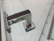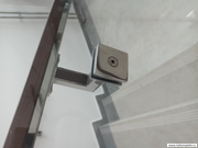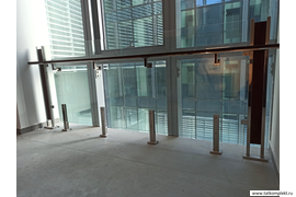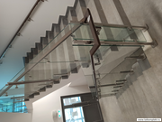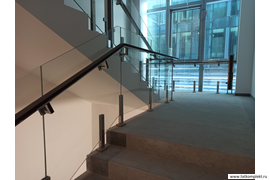 Лестничное ограждение со стеклом, поручнем из дуба и напольными стойками стеклодержателями. Авторская работа ООО "Комплект"