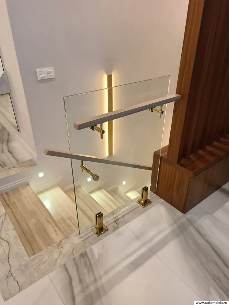 Стеклянное ограждение лестницы с фурнитурой нитрит титана под золото